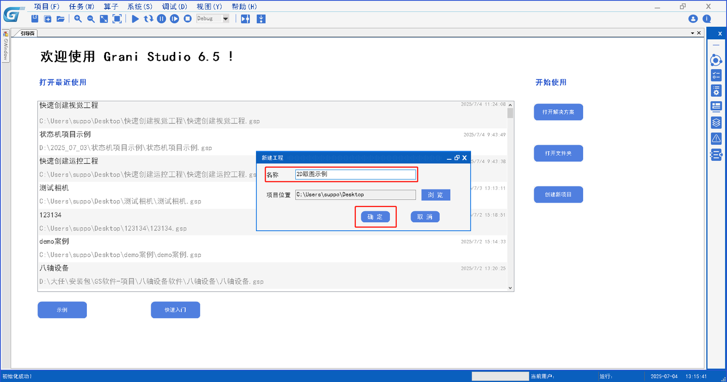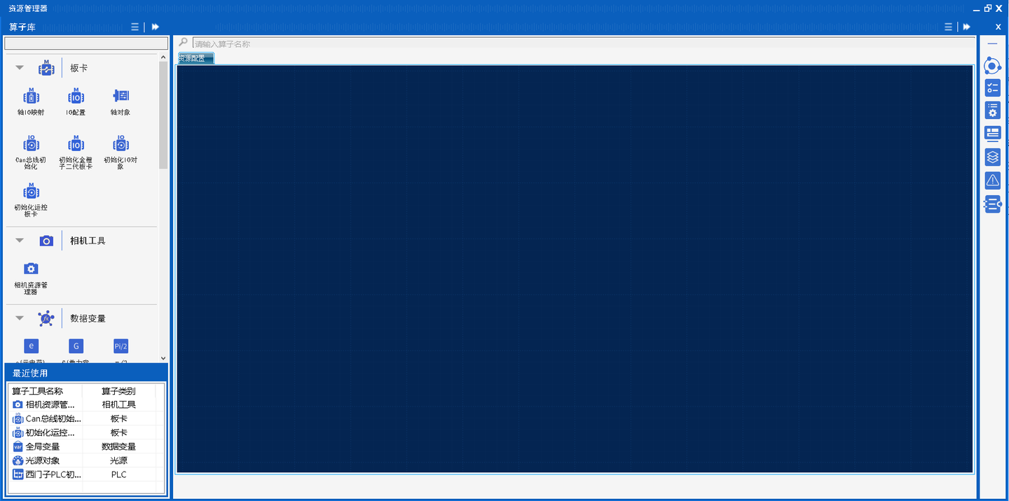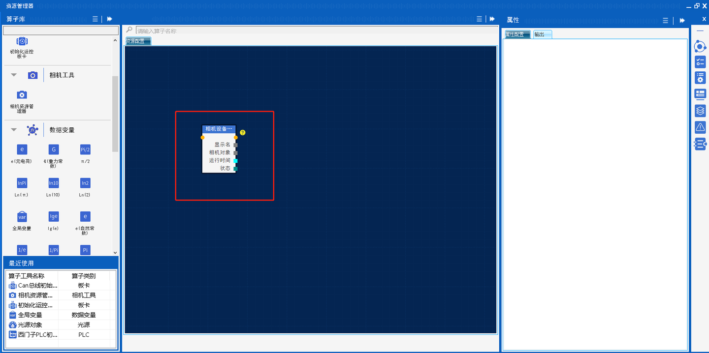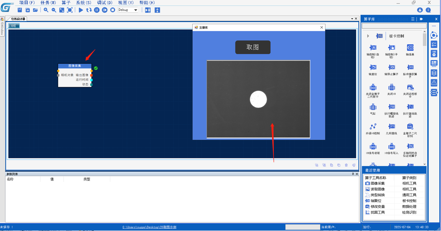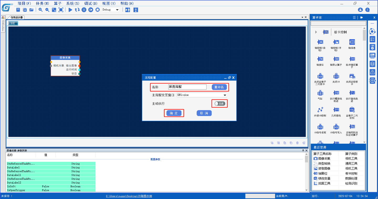 资源管理器主要用于初始化硬件资源(涵盖相机、板卡、IO、PLC、光源等)、定位变量、通讯连接(TCP、串口)等,通过配置配置算子参数,算子执行后输出定义的初始资源,这些初始资源会给到到主任务设计器中,我们以一个简单2D取图显示例子来说明: 打开平台软件,找到创建新项目按钮并点击  输入工程名称后点击确定完成新建  首先实现取图之前要先连接相机,连接相机是硬件资源,通过平台资源管理器算子库相机工具模块当中拖出相机资源管理器算子。  打开相机设备管理器算子,点击相机路径选择,路径跳转到软件根目录选择HardwareResources文件夹中的Camera文件夹。   根据相机型号选择Camera文件夹中对应的驱动库,加载显示到相机资源管理器列表,点击执行打开相机,同时会将资源给到主任设计器。  提供的主任务设计中的算子主要是同于实现控制逻辑的编写,其包含的算子被目前被分为板卡控制、相机工具、坐标变换、数据处理、检测识别、通用工具、几何测量、数学操作、图像处理、光源工具、逻辑流程、和PLC共12个模块,根据这些大的模块名称方便用于查找想使用的算子。  在主流程我们通过主任务设计器相机工具内的图像采集算子配置参数实现采图,配置如下:  将此流程名称修改为采图流程,并关闭主动执行,点击确定,完成配置,主任务设计器内的算子输出结果HMI设计器可以使用。  HMI设计器是提供了人机交互控件,可通过提供算子库中的板卡控制模块、容器组件、显示控件、输入控件等模组内的算子实现一个丰富多元的用户操作界面。  通过HMI设计一个和主任务设计器流程交互的界面,在HMI界面算子库输入控件内找到按钮控件,使用一个按钮控件,更改显示名称为取图,使用控件配置界面调整样式。  使用算子库显示控件模块内的图片框在HMI做一个显示相机采集图像的功能,将图片框控件拖到HMI上,进行如下配置: