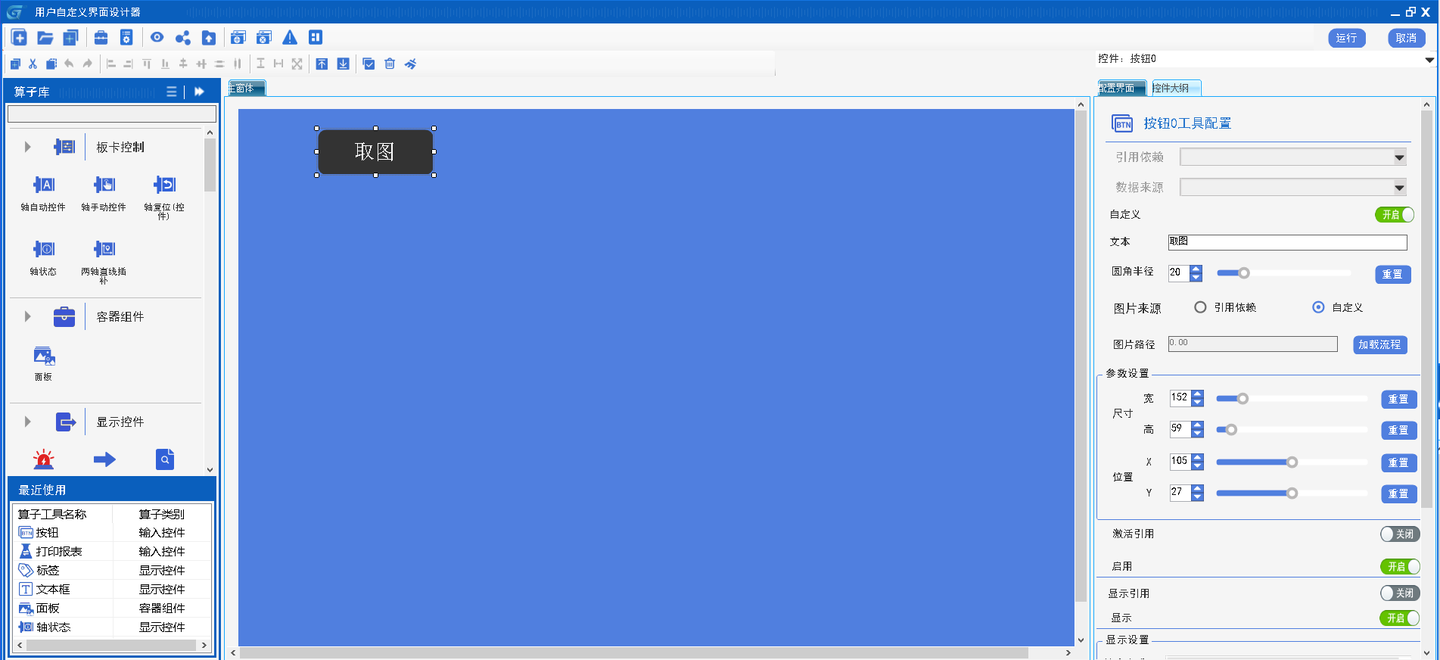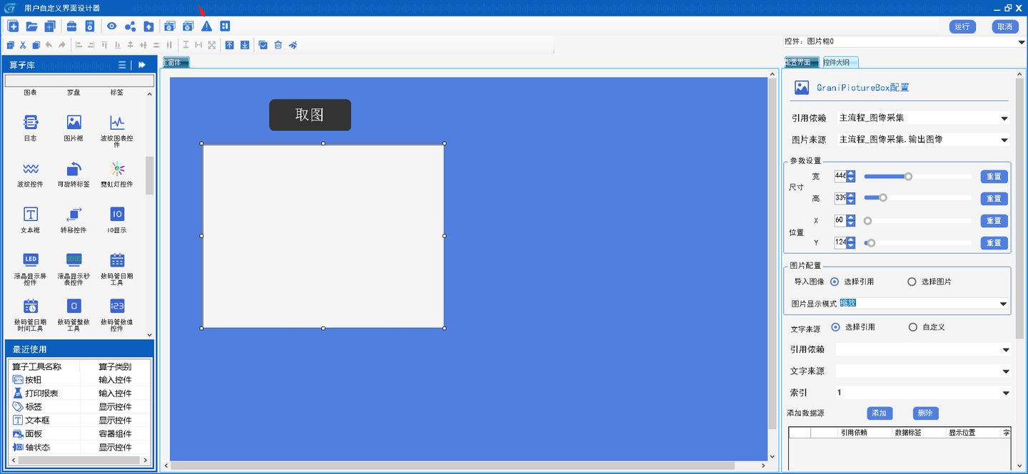 点击后显示事件管理器窗口,在事件源类显示着HMI上的控件,点击主窗体可进行查看。  配置按钮0绑定鼠标单击事件触发主流程执行。  点击添加事件,再点击确定完成事件绑定。  调整HMI尺寸并点击运行。  通过取图按钮可以看到触发了主流程执行并将相机取的图在HMI上显示。  三大界面之间通过资源共享与事件驱动实现协同,将工业自动化开发从“代码堆叠”转变为“模块拼图”,技术门槛降低、开发周期缩短、维护成本下降,无码化开发模式,GraniStudio 正在重塑工业自动化的技术生态,让更多企业能够快速实现数字化转型。